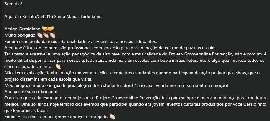 Um exemplo do quanto o Projeto deixa sua marca e promove transformações é o CEF 316 de Santa Maria. O Professor Sr. Renato enviou uma mensagem de agradecimento ao coordenador do projeto, Geraldinho Gonçalves. Na mensagem o prof. Renato destaca a grandeza que é o Projeto Grooveonline Prevenção. Veja a íntegra da mensagem: